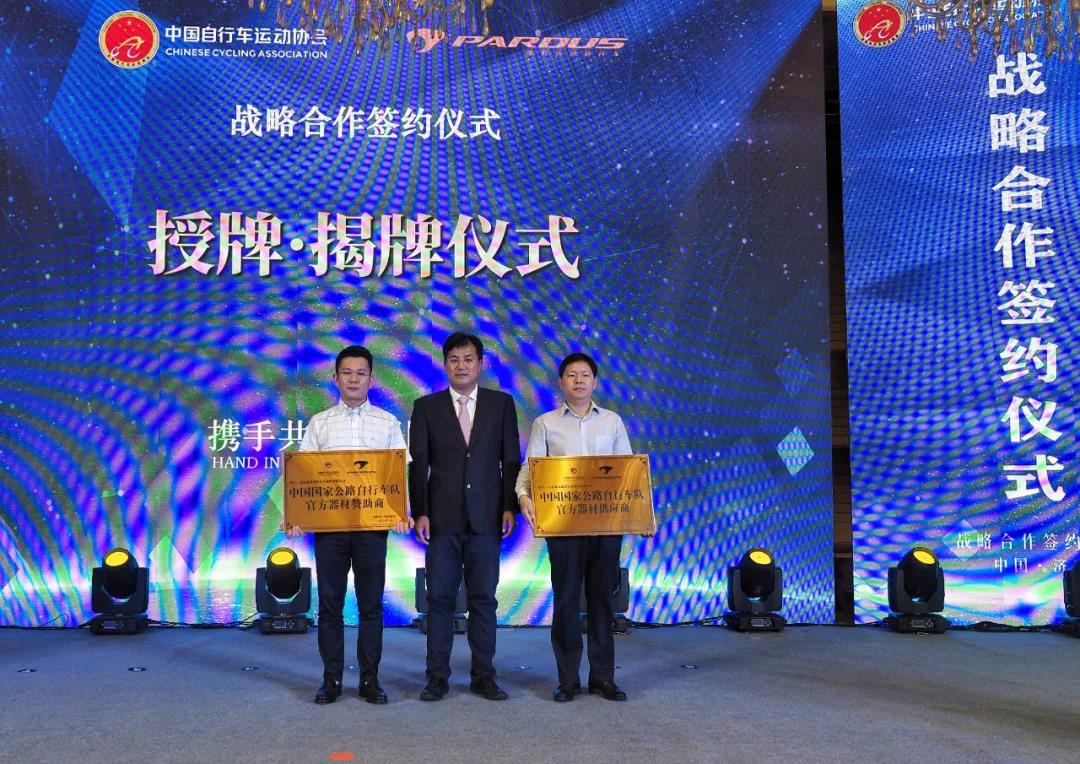 中国自行车运动协会副秘书长彭海波向pg电子集团副董事长卞青峰、总裁卞国峰授予:“中国国家公路自行车队官方器材赞助商、中国国家公路自行车队官方器材供应商”荣誉匾额。