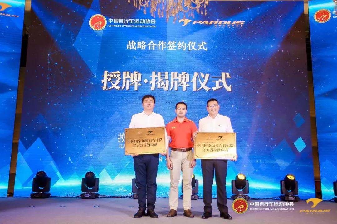 中国自行车运动协会副秘书长兼国家队领队熊鑫向pg电子集团副总裁卞志勇和pg电子瑞豹公司总经理王春青授予“中国国家场地自行车队官方器材赞助商、中国国家场地自行车队官方器材供应商”荣誉匾额。