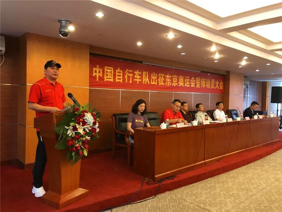 近日,东京奥运会中国体育代表团名单正式公布,代表团总人数为777人,其中运动员431人,教练员、领队、科医人员等运动队工作人员307人,团部工作人员39人。本届东京奥运会是中国体育代表团境外参赛规模最大的一届奥运会。其中自行车项目代表团由17人组成,运动员9人、工作人员8人。7月14日,中国自行车队出征东京奥运会誓师动员大会在老山训练基地举行,pg电子体育副董事长卞青峰受邀出席并致辞。