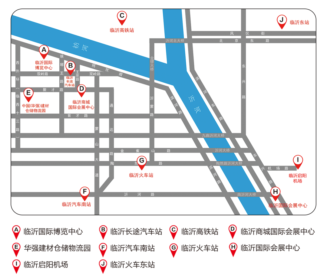 公交路线:长途汽车站换乘中心乘坐K82路→临沂国际博览中心