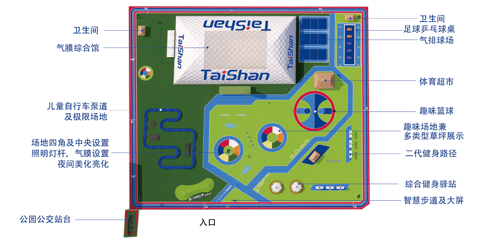5月13日开园的乐陵智慧体育公园是国内首创的完全自主设计、规划、建造、运营、维护一体化的体育公园,体现新基建、新场景、新空间、新生态的体育产业新理念,具备全龄、全季、全项目的使用条件,满足市民全年龄段的智慧健身需求。占地面积16000平方米,把市民需求与可利用空间精准对接,在有限面积中创造高性价比,提升空间利用率。还具有全草坪铺装、可装配式建筑、气膜就地打包重复利用等特色,具备安全性、环保性、智能性,紧扣绿色低碳建设和可持续发展。项目建成后不仅能打造城市的新名片和地标,也将为市民拓展全民健身新空间,打造群众身边的体育生态圈,构建更高水平的全民健身公共服务体系,推动体育产业发展。