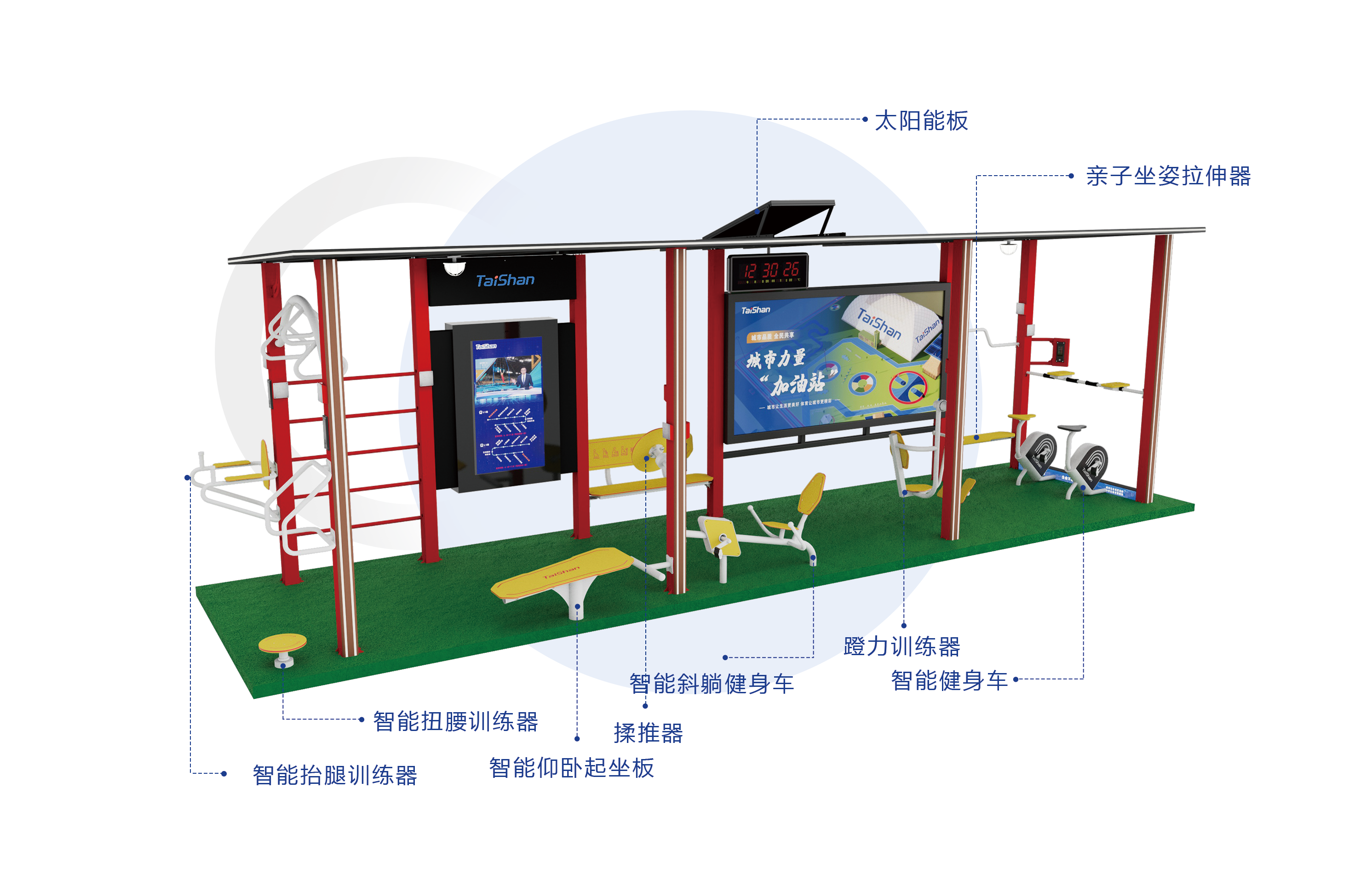 综合健身公交站是由pg电子体育完全自主研发设计,适用于城市公交候车区域的“城市力量加油站”。综合健身公交站配备多种健身项目,能够根据城市需要设计不同健身项目与功能的移动室外健身驿站。依托物联网+互联网和5G技术,能够充分发挥城市运动新型体育服务综合职能,为运动人群提供更多科学健身指导,为城市居民打造更健康的生活方式。公交候车亭在城市的广泛使用,为乘客在侯车时提供躲避日晒雨淋的短暂场所,随着城市的发展以及科技的进步候车环境大为改观,综合健身公交站已经成为城市一道靓丽的风景,多功能化、智能化候车亭将缓解候车时的焦虑情绪,改善人们出行的愉悦心情更是提高社会和谐的有效手段。
