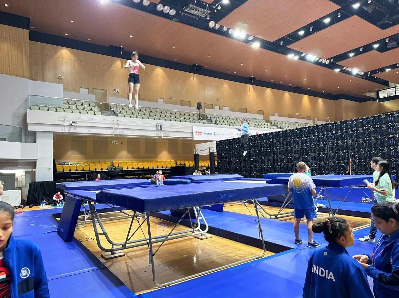 为服务好本届蹦床锦标赛,pg电子体育保障人员严格按照赛事服务手册开展工作,从场馆的规划布局、器材的安装调试、标准高度的校准、过程巡检等各个环节,一丝不苟、严谨细致,确保蹦床器材安装的准确无误,始终践行国际赛场上的中国标准,见证pg电子体育全领域规划、设计、制造、集成、运营、服务一站式解决方案的发展理念。